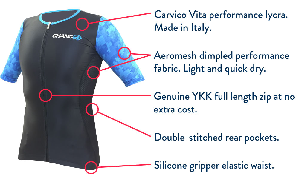Our tri suit fabric is sourced from Carvico in Italy, and is a soft, ultraflat, multi-directional stretch premium fabric, with muscle control compression, and pilling resistance for durability.